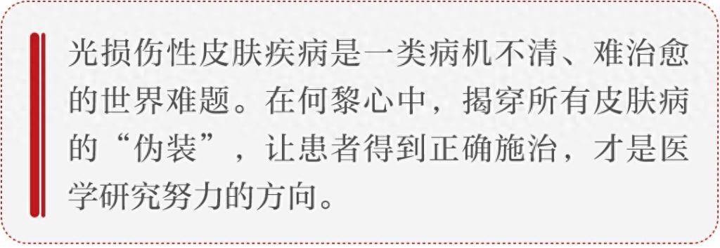 光损伤性皮肤疾病是一类病机不清、难治愈的世界难题。在何黎心中,揭穿所有皮肤病的“伪装”,让患者得到正确施治,才是医学研究努力的方向。为破解难题,她带领团队从发病机制到防治进行了系统研究。
